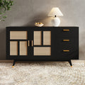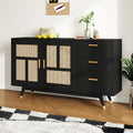 La combinación de clásico y moderno, gabinete negro con puerta decorativa de ratán de color natural es a la vez hermosa y práctica. Adoptando ratán plástico y tecnología de tejido receptor, el ratán a juego de color natural presenta un efecto visual perfecto, el estilo de aparato negro puede combinar con algunas de las decoraciones de su casa y agregar encanto a su hogar. Gran espacio de almacenamiento y calidad confiable, tamaño 160 * 40 * 87 cm, más grande que un gabinete de almacenamiento normal, puede aumentar el valor de su compra. Gran espacio de almacenamiento con estantes incorporados y tablero ancho para maximizar su espacio de almacenamiento. Tres cajones grandes se agregan a la derecha del gabinete. El gabinete multifuncional satisface una variedad de sus necesidades de almacenamiento como separador o buffet en su comedor o cocina. La parte superior del gabinete negro y las patas de la mesa de color dorado están pintadas, y las patas de madera maciza con función antivuelco garantizan una mayor seguridad. Las puertas decorativas de ratán plástico protegen contra la humedad y también se pueden usar como mueble de baño. El clásico armario de estilo bohemio y las puertas en tonos madera se adaptan a diversos estilos de interior y añaden un toque de elegancia rústica a tu espacio: una combinación de lo vintage y lo moderno. Nuestros armarios de almacenamiento incluyen instrucciones claras con ilustraciones y etiquetas para todas las piezas de repuesto. Los diversos tornillos están etiquetados y empaquetados en bolsas individuales, y todas las piezas están etiquetadas. La superficie lisa y lacada es muy fácil de limpiar.