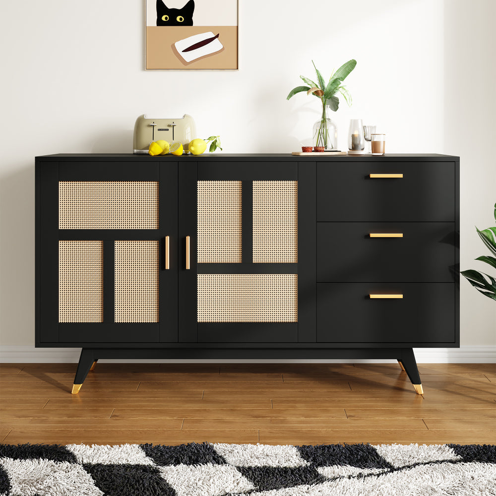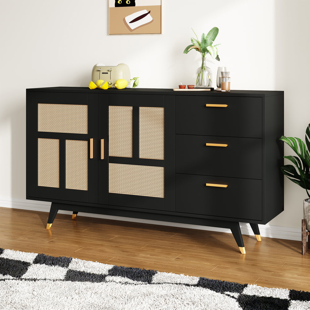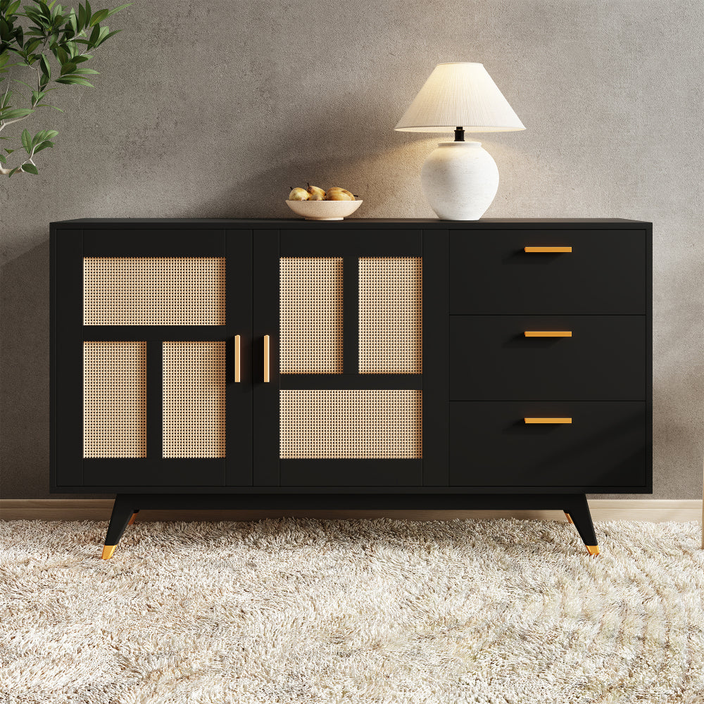 Armario Ratán Negro Moderno | 2 Puertas, 3 Cajones, Decoración Dorada
