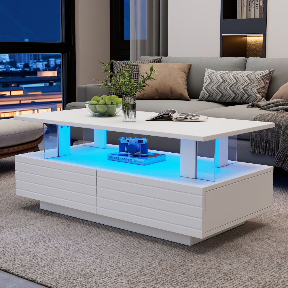 Mesa de Centro Blanca LED con Bluetooth | Doble Nivel, Almacenamiento